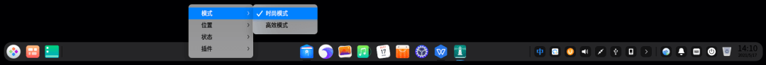 任务栏提供两种显示模式:时尚模式和高效模式,显示不同的图标大小和应用窗口激活效果。